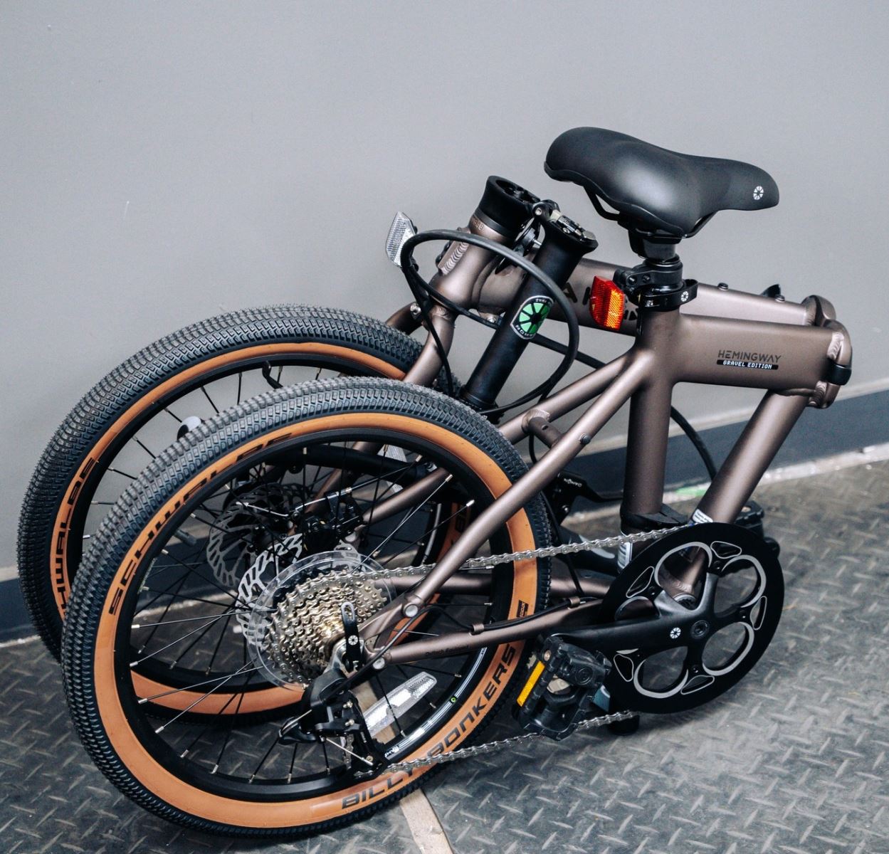 Điểm nổi bật nhất của Hemingway GR nằm ở thiết kế hướng địa hình (gravel), với bộ lốp Schwalbe Billy Bonkers kích thước lớn 20 x 2.0 inch, giúp tăng độ bám đường và khả năng vượt địa hình. Loại lốp này có khả năng chống trượt và chống thủng tốt, phù hợp cho cả đường đất, cát hay bề mặt gồ ghề.