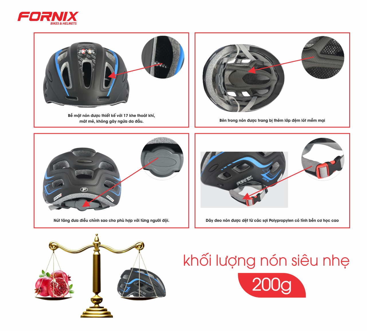 Ngoài việc thiết kế rất cá tính để cho các bạn trẻ chọn lựa, Fornix còn chú trọng đến chất lượng và cấu tạo sản phẩm. Nón bảo hiểm có trọng lượng nhẹ hơn hẳn so nón bào hiểm xe máy để hạn chế áp lực lên phần đầu và cổ, với tư thế của người đạp xe thì khi mỏi bất cứ bộ phận nào cũng rất khó chịu. Với thiết kế khí động học hợp lí, Fornix đã làm hài hòa sức nặng, kết hợp cùng 3 lớp bảo vệ chắn chắn: phần vỏ ngoài tạo dáng vừa nhẹ vừa bền, phần mút cứng bao bọc và vải mềm đính vào để đầu tiếp xúc với nón thật êm ái. Phần quai đeo cũng được tập trung thiết kế dễ tháo gỡ nhưng vẫn chắc chắn giữ nón với đầu, chế độ tăng-đơ không chỉ ở phần dây mà còn phần bên trong nón để thích hợp với kích cỡ vòng đầu khác nhau.